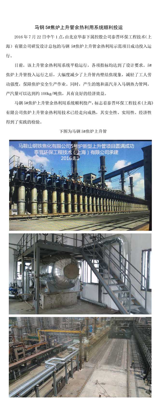 马钢5#焦炉上升管余热利用系统顺利投运